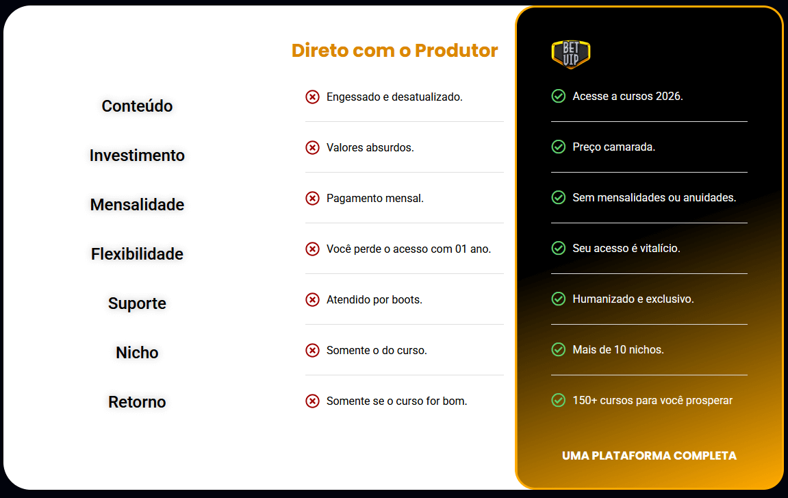 Você que tem acesso ao BETVIP pode solicitar novos cursos no nosso WhatsApp. Estamos sempre correndo atrás de novidades.